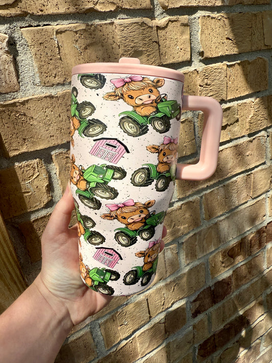 Pink Highland Cow Tractor Stainless 20 oz Tumbler