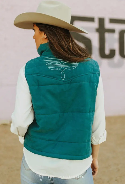Womens Teal Puffer Boot Stitch Embroidered Vest